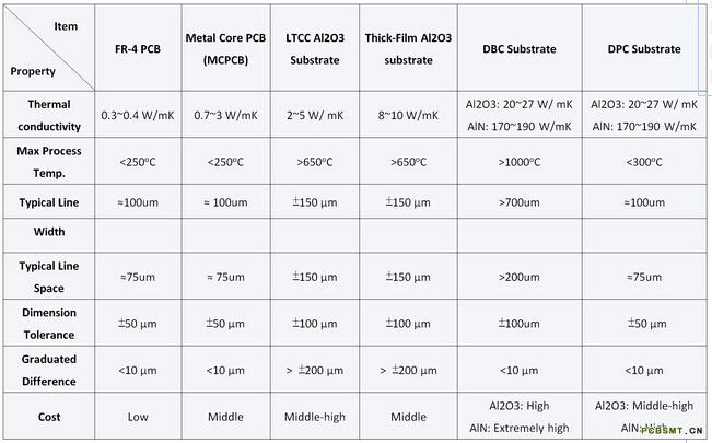 目前市場上廣泛使用的電路板類型如下表一所示,其中陶瓷基板其高導(dǎo)熱系數(shù)、高線路解析度、低累進公差、及允許打線工藝與直接共晶工藝等特性皆優(yōu)于FR-4 PCB與MCPCB。但是,陶瓷基板并非皆具有相同的特性,因工藝與材料的差異,陶瓷基板因而可分類為:低溫共燒陶瓷(LTCC, Low-Temperature Co-fire Ceramics)基板、厚膜(Thick-Film)陶瓷基板、DBC (Direct Bonding Copper)陶瓷基板與DPC (Direct Plating Copper)陶瓷基板,其中DPC陶瓷基板又可稱為薄膜(Thin-Film)陶瓷基板。