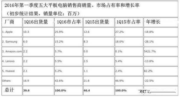 前兩大平板電腦制造商仍然保持著它們的地位:蘋果排在一名,三星排在二名。IDC公司稱,在2016年一季度,全球平板電腦的下滑主要是因?yàn)?ldquo;季節(jié)性下滑”和“整體表現(xiàn)冷淡的消費(fèi)者群體”。前五大平板電腦供應(yīng)商占全球平板電腦市場(chǎng)57.4%的份額,較去年同期的53.1%所有增長(zhǎng)。