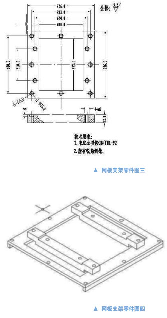 為保證網(wǎng)板支架和鋼模板安裝定位,使用連接固定螺釘(Screw),保證其安裝連接的穩(wěn)定和通用性,對(duì)安裝連接螺釘、網(wǎng)板支架連接孔、網(wǎng)板連接孔的尺寸要求比較特殊。經(jīng)過(guò)分析和實(shí)際使用,可以采用M4的公制螺釘和螺紋孔;或者采用5/32的美制螺釘和螺紋孔,以上兩種尺寸和公英制基本上可以通用。