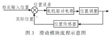 如圖3滑動模塊流程示意圖所示,本系統(tǒng)方案設(shè)計在傳輸系統(tǒng)和smt生產(chǎn)設(shè)備的連接處,增設(shè)一個滑動裝置,主要由滑動板、滾珠和位置傳感器組成,形成了一個閉環(huán)控制,起到平衡作用。在生產(chǎn)過程中,由模塊裝置上的位置傳感器實時將實際位置信號反饋給系統(tǒng),與給定輸入位置信號相比較產(chǎn)生一個位置誤差信號,然后由這個誤差信號驅(qū)動電機運轉(zhuǎn)進行位置調(diào)整。當設(shè)備平衡時,位置誤差為零,不進行位置調(diào)整;當傳輸機有偏斜時,位置誤差不為零,由它驅(qū)動電機運轉(zhuǎn),使設(shè)備進行一定的位置調(diào)整。通過這套裝置,消除由振動產(chǎn)生位置偏移、利于整個生產(chǎn)線的生產(chǎn)、增強各設(shè)備之間銜接。
