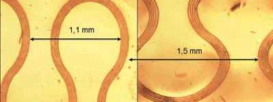 將感光耐蝕膜通過(guò)旋轉(zhuǎn)噴涂的方式涂在銅箔上,再通過(guò)馬蹄形光掩模板刻蝕出圖案,這種形狀相比其他形狀(例如橢圓形)能夠減少46%的拉力。另外,將每條導(dǎo)線分成四條并行導(dǎo)線的方式也增大了電路的彈性,不影響性能。