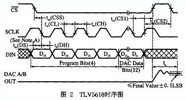 TLV5618是TI公司帶緩沖基準(zhǔn)輸入(高阻抗)的雙路12 位電壓輸出DAC,通過(guò)CMOS 兼容的3線串行總線實(shí)現(xiàn)數(shù)字控制。器件接收16 位命令字,產(chǎn)生兩路D/A模擬輸出。TLV5618只有單一I/O周期,由外部時(shí)鐘SCL K決定,延續(xù)16 個(gè)時(shí)鐘周期,將命令字寫入片內(nèi)寄存器,完成后即進(jìn)行D/A轉(zhuǎn)換。TLV5618讀入命令字是從CS的下降沿開始有效,從下一SCLK的下降沿開始讀入數(shù)據(jù),讀入16位數(shù)據(jù)后即進(jìn)入轉(zhuǎn)換周期,直到下次出現(xiàn)CS的下降沿。 其操作時(shí)序圖如圖2 所示。