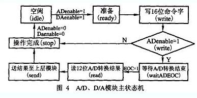 系統(tǒng)設(shè)計(jì)中,將AD、DA操作封裝成一單獨(dú)模塊,由上層控制模塊輸出命令字及控制信號(hào)啟動(dòng)本模塊的相應(yīng)操作,操作完成后(進(jìn)入idle狀態(tài)) ,本模塊發(fā)出相應(yīng)狀態(tài)信號(hào)至上層模塊。