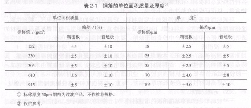 銅箔的表面應(yīng)光潔,不得有明顯的皺折、氧化斑、劃痕、麻點(diǎn)、凹坑和玷污。305g/m2及以上銅箔的孔隙率要求在300ram×300mm面積內(nèi)滲透點(diǎn)不超過(guò)8個(gè);在0.5m2面積上銅箔的孔隙總面積不超過(guò)直徑為0.125mm的圓面積。305g/m2以下銅箔的孔隙率和孔尺寸由供需雙方商定。銅箔的單位面積重量及厚度應(yīng)符合表2.1規(guī)定。