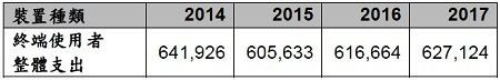 2014~2017年全球終端使用者設(shè)備支出(單位:百萬美元)