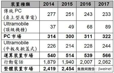 2014~2017年全球各類設(shè)備出貨量(單位:百萬臺)(來源:Gartner,2015年7月)