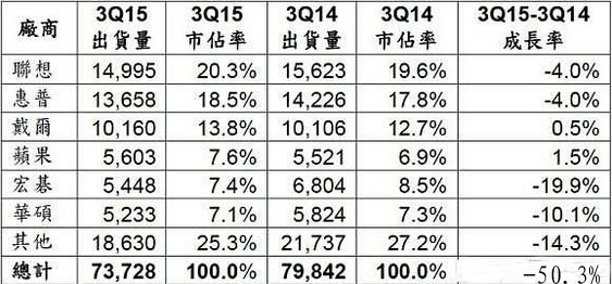 2015年三季全球PC廠商單位出貨量預(yù)估值 (單位:千臺(tái))