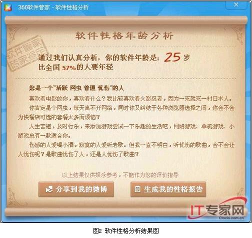 小編還發(fā)現(xiàn),360軟件性格分析還能分析出我們的軟件年齡,如小編只有25歲(竊喜),說明人老心不老哦??蛇@軟件年齡是怎么得出來的呢?小編猜測是根據(jù)安裝軟件的歷史,比如電腦中安裝了WinZip等這類老古董的軟件,電腦會更給你加幾歲;如果像小編360都時刻更新新的豆瓣電臺,那年齡理應(yīng)比較年輕了。